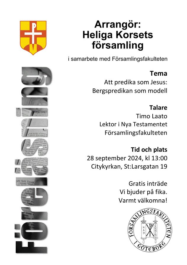 Den 28 september bjuder Heliga Korset församling, i samarbete med Församlingsfakulteten i Göteborg, in till en teologisk föreläsning på temat ”Att predika som Jesus: Bergspredikan som modell”. Alla oavsett förkunskaper är hjärtligt välkomna! Föreläsningen är den första av två som kommer gå av stapeln under hösten -24. För mer information, se nedan.